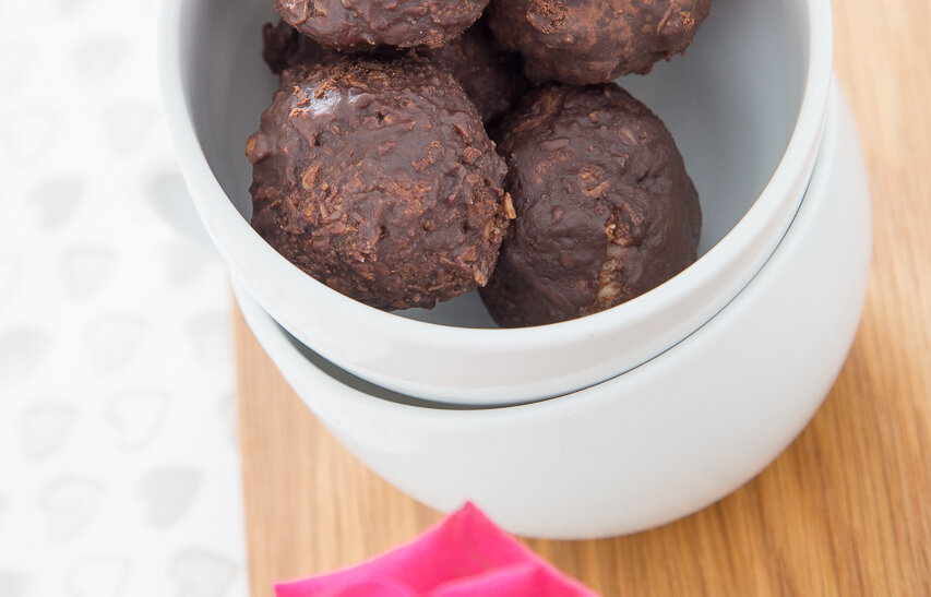 Add the oats, coconut, dates, water and maple syrup into a blender, blending for 30 seconds. Pour into a large bowl and mix. In a bain marie or microwave, melt the chocolate and coconut oil. Create balls by squeezing not rolling the mixture (as it’s fairly dry). If it’s too dry to roll add a little more water and stir. Then using a folk, dip into the chocolate, letting the chocolate drip from the balls and refrigerate.